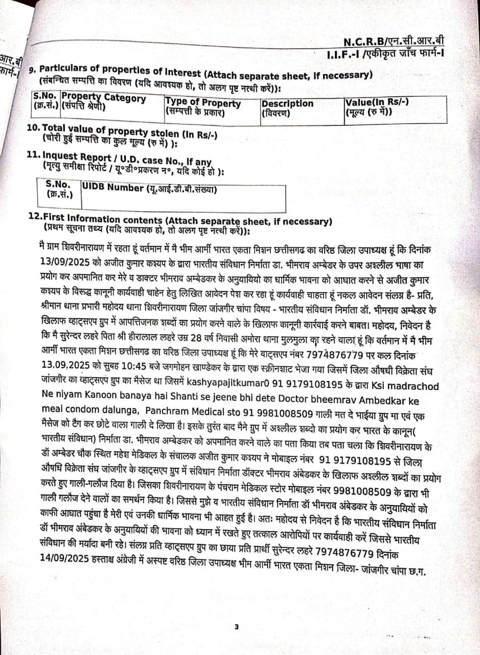 भीम आर्मी के वरिष्ठ जिला उपाध्यक्ष सुरेंदर लहरे ने बताया कि शिवरीनारायण के डॉ भीमराव अंबेडकर चौक स्थित महेश मेडिकल स्टोर के संचालक अजीत कुमार कश्यप द्वारा व्हाट्सएप ग्रुप जिला औषधि संघ में संविधान निर्माता डॉ भीमराव अंबेडकर के खिलाफ अमर्यादित शब्दों का प्रयोग करते हुए गाली गलौज की। इसकी जानकारी भीम आर्मी को होने के बाद भीम आर्मी की पूरी जिला इकाई की टीम शिवरीनारायण थाना पहुंच गई। घटना के बाद से आरोपी युवक फरार हो गया है। उसके बाद आरोपी युवक के खिलाफ कड़ी कार्यवाही की मांग करने लगे। भीम आर्मी ने इस मामले में आरोपी युवक के खिलाफ लिखित में थाना में शिकायत की है।