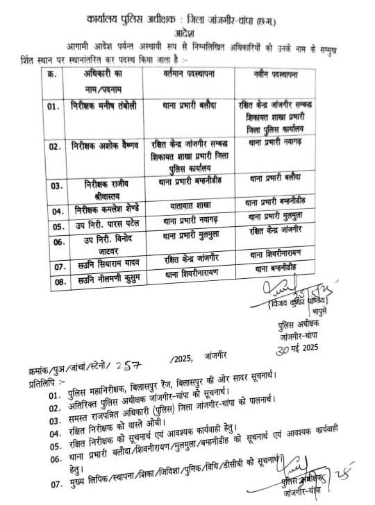 मिली सूची के अनुसार 8  पुलिस अधिकारी का तबादला किया है। जिसमें निरीक्षक मनीष तंबोली को थाना प्रभारी बलौदा से रक्षित केंद्र, निरक्षक अशोक वैष्णव को रक्षित केंद्र से नवागढ़ प्रभारी, निरीक्षक राजीव श्रीवास्तव को बम्हनीडीह से थाना प्रभारी बलौदा, निरक्षक कमलेश को यातायात शाखा से थाना प्रभारी, उप निरीक्षक पारस पटेल को नवागढ़ से मुलमुला थाना प्रभारी और उप निरीक्षक विनोद जाटवार को मुलमुला से रक्षित केंद्र भेजा गया है। इसी तरह सहायक उप निरीक्षक सियाराम यादव को रक्षित केंद्र से शिवरीनारायण और सहायक उप निरीक्षक नीलमणि कुसुम को थाना शिवरीनारायण से बम्हनीडीह भेजा गया है|