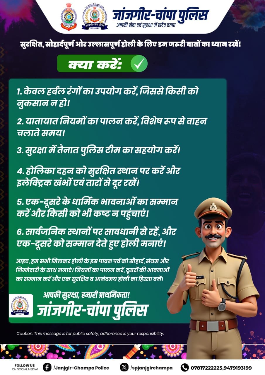 * आगामी होली पर्व की सुरक्षा व्यवस्था को मद्देनजर रखते हुये जांजगीर-चांपा पुलिस की चाक चौबंद व्यवस्था * जिले के सभी थाना/चौकी क्षेत्र अंतर्गत लगातार पुलिस द्वारा भ्रमण/पेट्रोलिंग कर हुड़दंगियों /संदिग्ध व्यक्तियों पर कड़ी नजर रखी जाएगी * बाइक पेट्रोलिंग, गांव/शहर की सकरी गलियों तक पुलिस की पहुंच रहेगी * जिले के सभी थाना/चौकियों में चीता स्क्वायड टीम बनाया गया है, जिसके द्वारा हुड़दंगियों करने वालो के विरूद्ध सख्त कार्रवाई की जावेगी * DJ बाजा बजाने वालों के विरुद्ध सख्त कार्रवाई, दोपहिया वाहन में तीन सवारी, मुखौटा लगाकर व शराब पीकर वाहन चलाने और शांति भंग करने वालो पर होगी कठोर कार्यवाही * गुंडे बदमाश हो जाये सावधान, जांजगीर पुलिस की चेतावनी, होली त्योहार के दौरान गुंडा बदमाश असामाजिक तत्वों पुलिस की कड़ी नजर बदमाशी करने पर की जाएगी सख्त कानूनी कार्यवाही